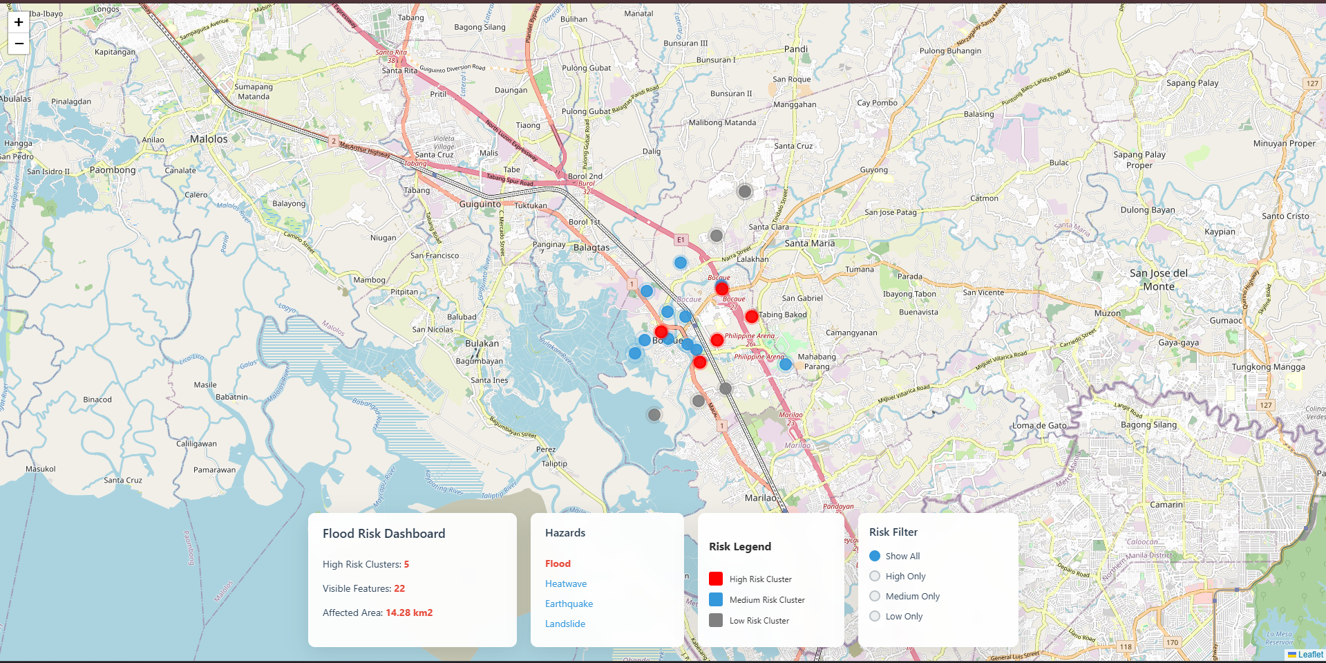 GIS platform visualizing 100-year flooded areas in Bulacan with spatial data analysis and mapping.
